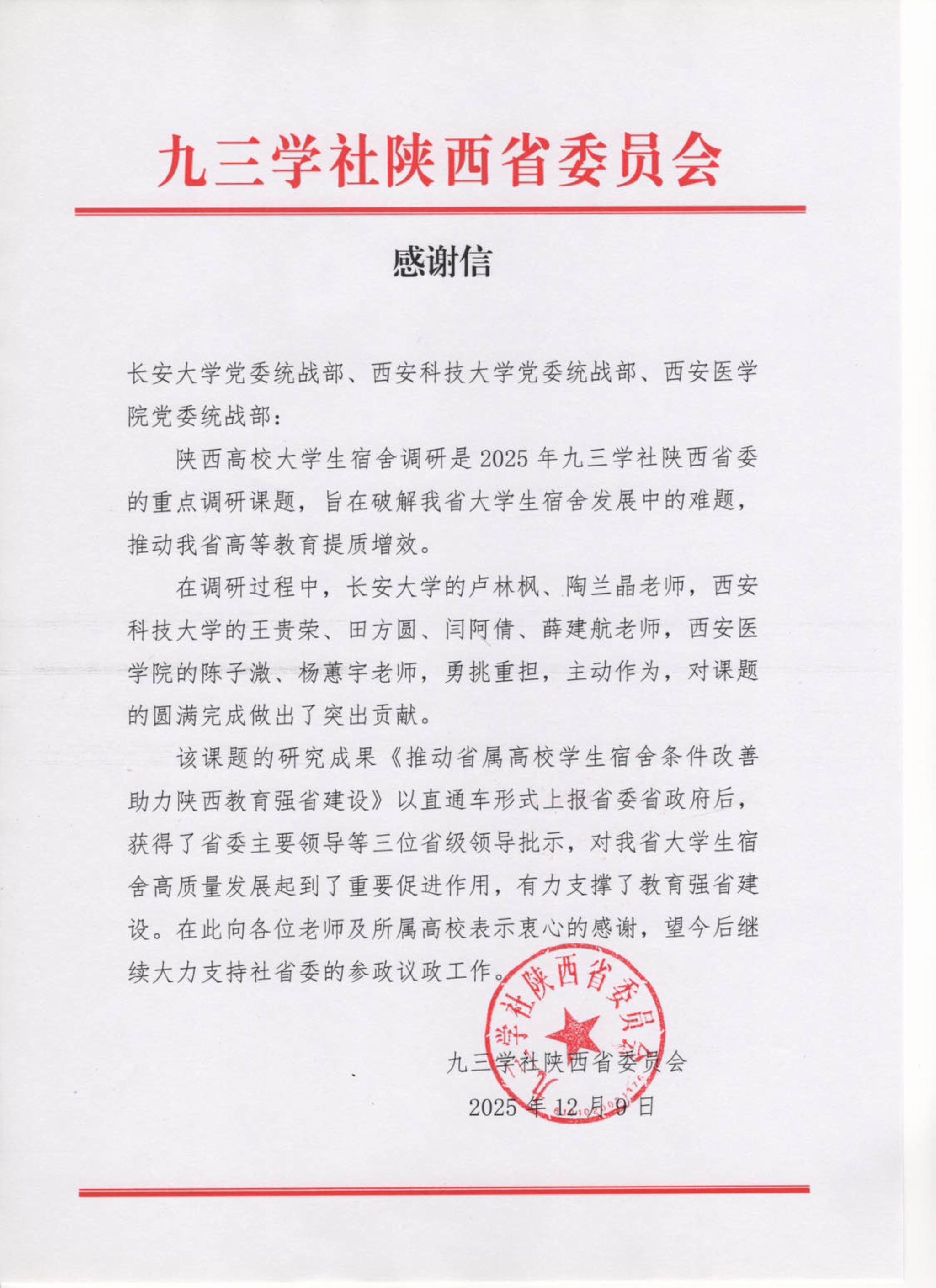 近日,我校党委统战部收到九三学社陕西省委员会发来的感谢信,信中对我校九三学社支社杨蕙宇、陈子溦两位老师在“陕西高校大学生宿舍调研”重点课题研究中所取得的成果《推动省属高校学生宿舍条件改善助力陕西教育强省建设》给予高度评价,并对两位教师为课题圆满完成所作出的突出贡献表示充分肯定和诚挚感谢。