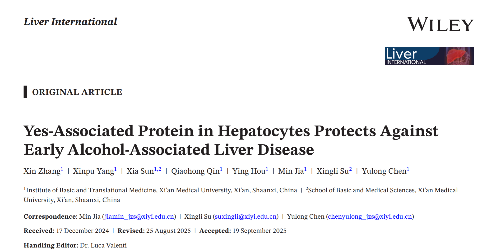2025年11月28日在肝病学领域高水平期刊Liver International(中科院2区,IF=5.2,五年IF=5.6,Top)在线发表题为“Yes-Associated Protein in Hepatocytes Protects Against Early Alcohol-Associated Liver Disease”[肝细胞YAP保护早期酒精相关性肝病]的研究论文,揭示了肝细胞YAP经OSM-STAT3轴调控CD36改善酒精相关性肝病的新机制,为早期酒精相关性肝病的药物研发提供了新的靶点。西安医学院为唯一第一作者和通讯作者单位,陈玉龙教授和苏兴利教授为通讯作者,张欣为第一作者。
