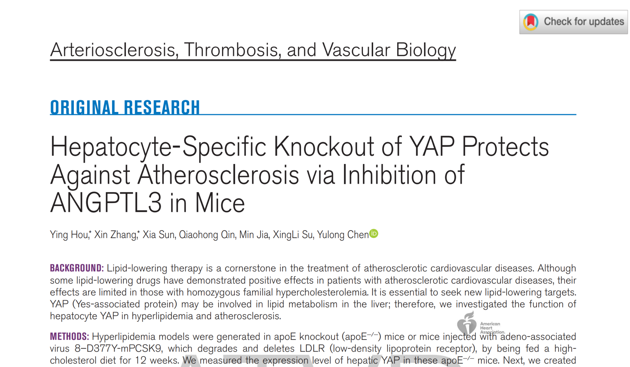 2026年2月27日在美国心脏协会动脉硬化、血栓和血管生物学委员会官方期刊Arteriosclerosis, Thrombosis, and Vascular Biology(中科院1区,IF=7.4,五年IF=8.6,TOP)在线发表题为“Hepatocyte-Specific Knockout of YAP Protects Against Atherosclerosis via Inhibition of ANGPTL3 in Mice”[肝细胞YAP敲除通过抑制ANGPTL3发挥动脉粥样硬化保护作用]的研究论文,揭示了YAP通过TEAD4调控ANGPTL3发挥独立于低密度脂蛋白受体改善高脂血症和动脉粥样硬化新机制,为动脉粥样硬化心血管疾病的药物研发提供了新的靶点,特别是对纯合子家族性高胆固醇血症患者的治疗意义重大。西安医学院为唯一第一作者和通讯作者单位,陈玉龙教授和苏兴利教授为通讯作者,侯颖为第一作者。