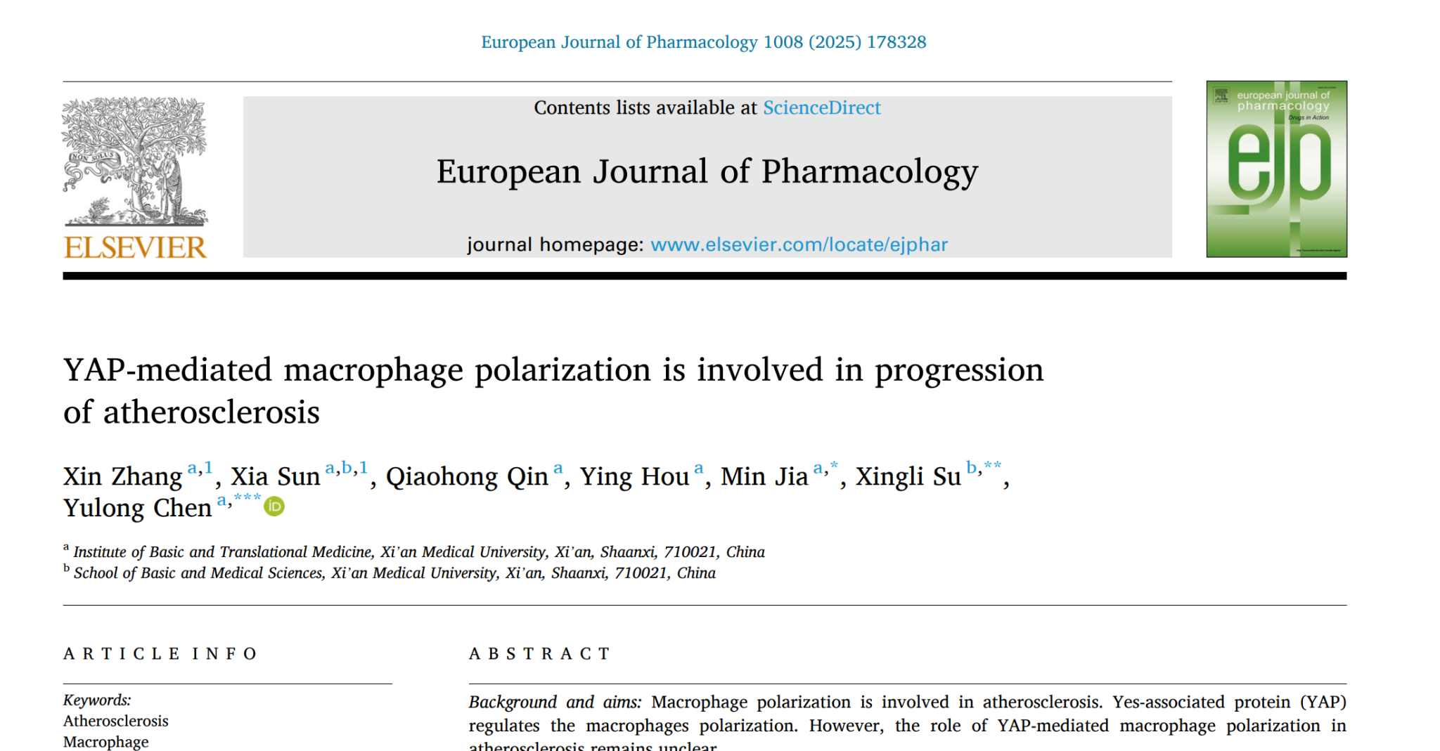 2025年12月5日在药学高水平期刊European Journal of Pharmacology(中科院2区,IF=4.7,五年IF=4.7)在线发表题为“YAP-mediated macrophage polarization is involved in progression of atherosclerosis”[YAP介导的巨噬细胞极化参与动脉粥样硬化进展],揭示了巨噬细胞YAP经ox-LDL-CD36轴调控巨噬细胞泡沫化加重动脉粥样硬化的新机制,为动脉粥样硬化心血管疾病的药物研发提供了新的靶点。西安医学院为唯一第一作者和通讯作者单位,陈玉龙教授和苏兴利教授为通讯作者,张欣为第一作者。