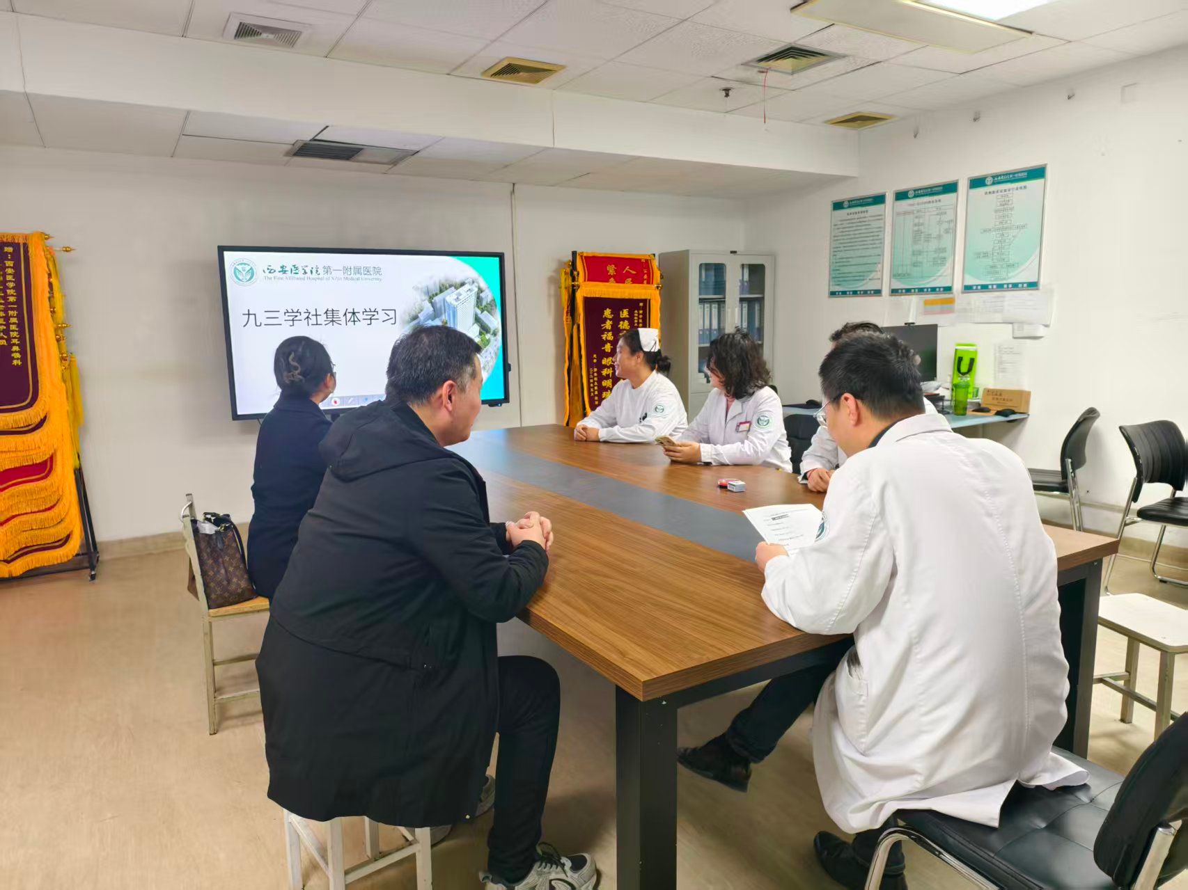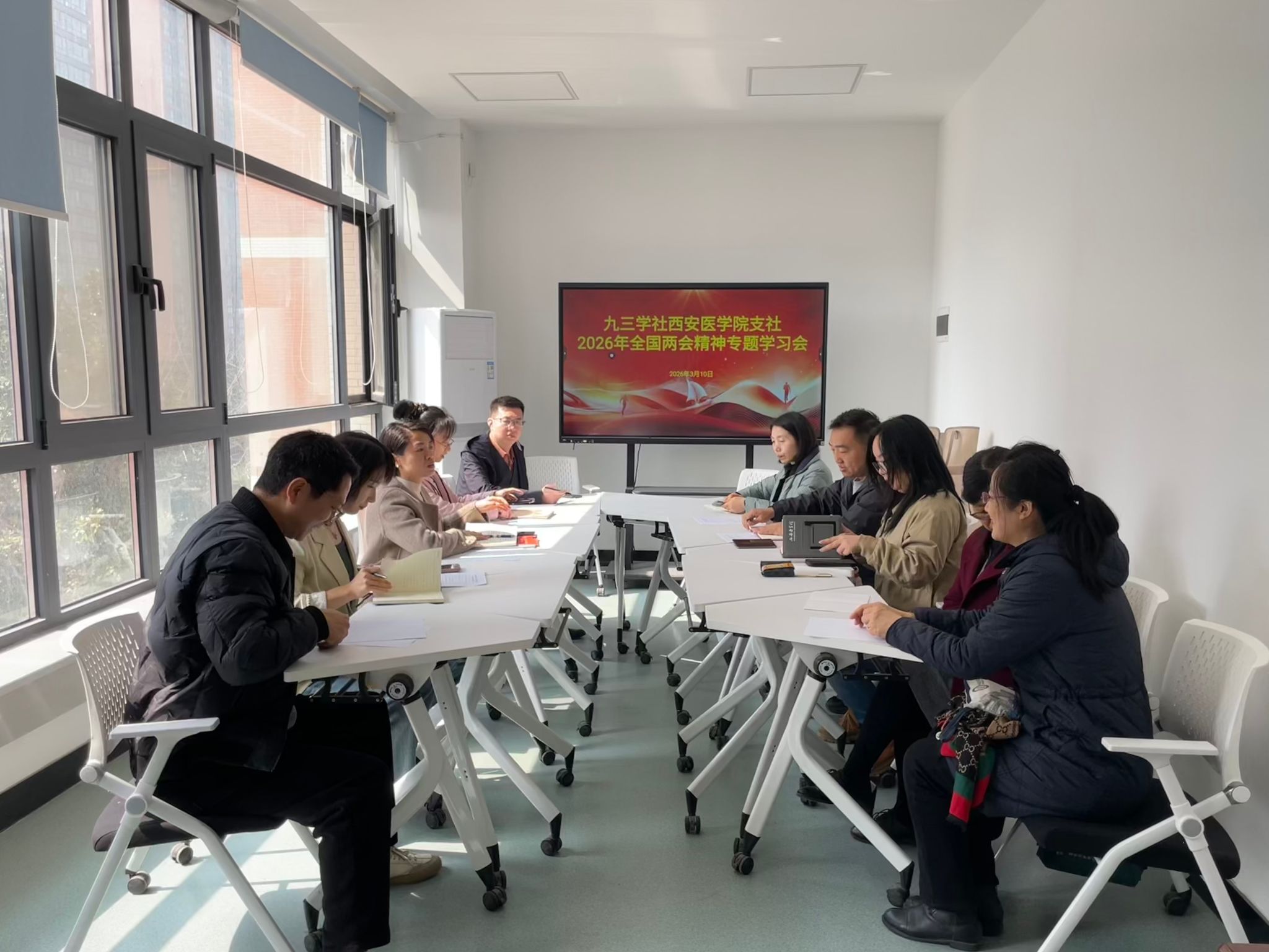 在全国两会召开期间,支社组织社员通过线上方式集中收看两会直播,及时了解会议动态,认真学习会议精神。3月10日,校本部社员在临床医学院会议室开展线下集中学习研讨,围绕2026年政府工作报告重点内容及相关重要讲话精神开展专题学习。会上,支社组织委员郑蕾领学《2026年两会政府工作报告——“十五五”时期主要目标指标、重大战略任务、重大工程项目》,系统梳理了“十五五”时期国家发展的总体目标与重点任务,帮助社员深入理解未来五年国家发展的战略部署。社员周韵领学《习近平看望参加政协会议的农工党九三学社医药卫生界社会福利和社会保障界委员时的讲话精神》,重点解读了习近平总书记对医药卫生界委员的重要指示与殷切期望。入社积极分子李小承领学《习近平:让愿担当、敢担当、善担当蔚然成风》,引导大家深刻认识新时代担当作为的重要意义,激励社员在本职岗位和履职实践中主动作为、积极奉献。在交流环节,与会社员结合自身教学、科研和医疗工作实际展开讨论,纷纷表示要把学习贯彻全国两会精神与履行参政议政职责、推进本职工作紧密结合,为推动医学院校发展和医疗卫生事业进步贡献力量。西安医学院第一附属医院分会场也于3月11日组织开展集中学习。会议由支社社会服务委员张海雄主持,带领社员和入社积极分子围绕2026年全国两会精神进行了深入学习和交流研讨,进一步推动两会精神在基层组织落地落实。